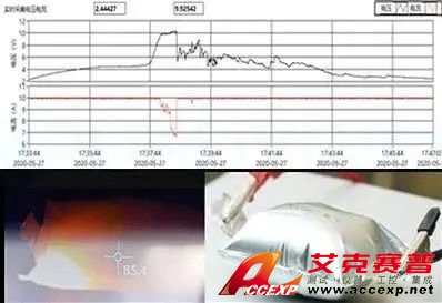 以過充電為例,針對過充電對電池單體進行測試,電池電壓不斷變大,溫度不斷升高,電池內部高電壓造成電解液分解,電池內部產生大量氣體,電池鼓脹,繼續充電,在高溫高壓下大量氣體從內部噴出,形成煙霧,隨后被擊穿導通。