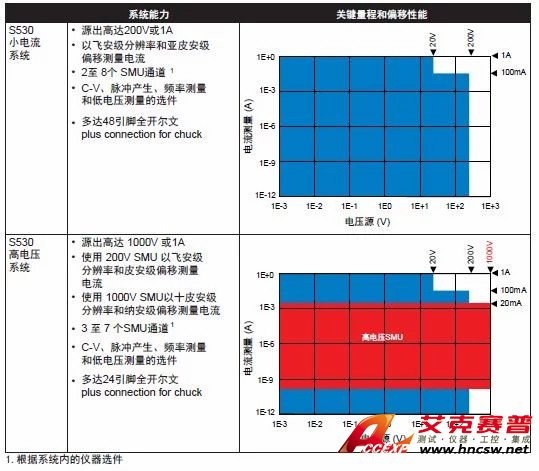 提供兩種不同的系統配置,能夠滿足不同的參數測試應用環境。S530小電 流系統可配置2至8路源測量單元(SMU)通道,具有亞皮安級測量分辨率,并 為探針卡提供了全面的小電流保護,使其非常適合于亞微米MOS硅工藝的特性分析。S530高電壓系統可配置3至7路SMU通道,能夠源出高達1000V的電壓,可用于汽車電子和功率管理器件所需的各種擊穿和漏流測試。