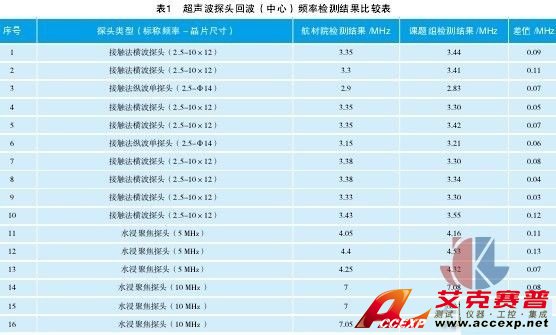 為了驗(yàn)證測(cè)試結(jié)果的正確性,采用本文中的裝置和方法對(duì)16個(gè)超聲波探頭回波頻率進(jìn)行測(cè)試,并與北京航空材料研究院無損檢測(cè)研究室探頭頻譜檢測(cè)結(jié)果進(jìn)行了比對(duì),結(jié)果見表1。可以看出,測(cè)試結(jié)果與航材院無損檢測(cè)研究室檢測(cè)結(jié)果具有很強(qiáng)的一致性,差值范圍在0.01MHz~0.13MHz之間。