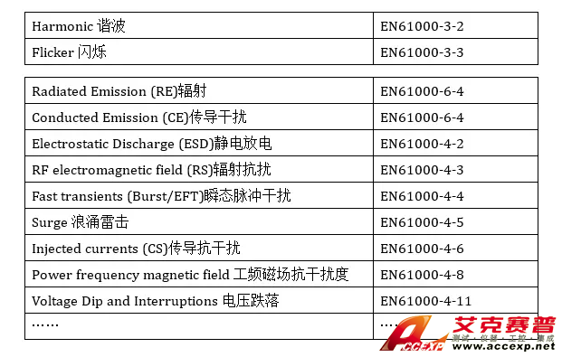EN61000-3-2、EN61000-3-3、EN61000-6-4、EN61000-4-2、EN61000-4-3、EN61000-4-4、EN61000-4-5、EN61000-4-6、EN61000-4-8、EN61000-4-11。
