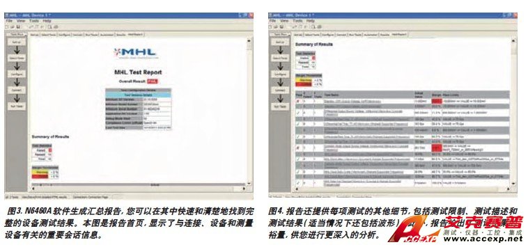 N6460A MHL 源端一致性測試軟件能夠生成全面的報告,其中不僅包括被測設備的性能和狀態(tài),還包括最重要測量的屏幕快照,以便于您進行閱讀和分析。報告的首頁會列出標準規(guī)范測試認證程序中要求的設備和配置細節(jié)。它還提供帶有超文本鏈接的結果表格,使您可以快速找到感興趣的測量報告部分。圖 4. 報告還提供每項測試的其他細節(jié) , 包括測試限制、測試描述和測試結果 ( 適當情況下還包括波形 )。此外 , 報告給出了測試結果的裕量 , 供您進行更深入的分析。圖 3. N6460A 軟件生成匯總報告 , 您可以在其中快速和清楚地找到完整的設備測試結果。本圖是報告首頁 , 顯示了與連接、設備和測量設備有關的重要會話信息。報告隨后以表格形式列出結果匯總。該表格為用戶提供了大量即時可見的信息。界面左側可以非常明顯地立即顯示設備測試狀態(tài) ( 合格或不合格 )。如果您將運行多項測試,或測試要求有多種分辨率,您將接到警告,要求您留意給定測試的總體狀態(tài),包括測試的嘗試次數(shù)以及測試失敗的次數(shù)。測試名稱帶有超級鏈接,使您可以直接訪問希望查看的結果 ( 參見下面圖 5 中的眼圖結果 )。該數(shù)據(jù)還可通過訪問“結果 (Results)”選項卡獲得.