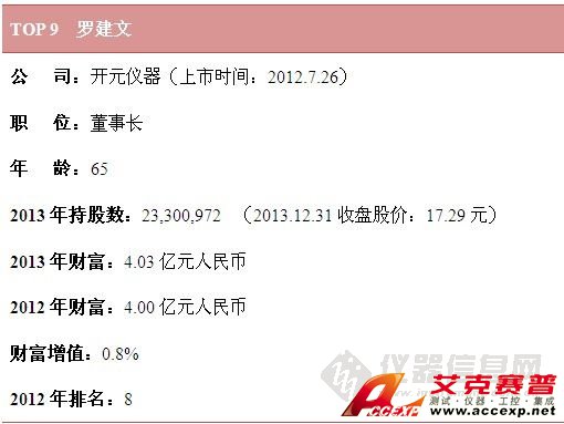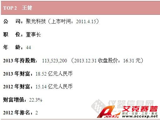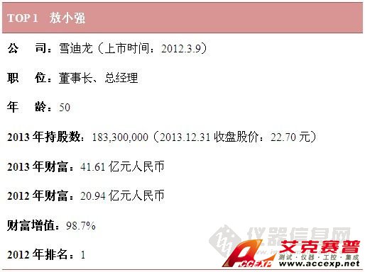就財富值而言,雪迪龍敖小強憑借100%的增幅穩居財富榜榜首,位居第2位的是聚光科技董事長王健,其2013年財富為18.52億元人民幣,排名第3的是天瑞儀器董事長劉召貴。