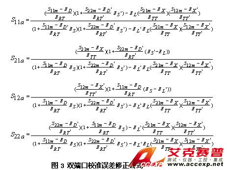 以上12項(xiàng)系統(tǒng)誤差,通過(guò)雙端口校準(zhǔn)可以獲得。校準(zhǔn)后,對(duì)被測(cè)件進(jìn)行測(cè)量,測(cè)量過(guò)程得到四個(gè)測(cè)量S參數(shù)S11m,S21m,S12m和S22m。基于圖3所示的四個(gè)雙端口誤差修正公式,消除12項(xiàng)系統(tǒng)誤差,最終計(jì)算出實(shí)際需要的被測(cè)件的四個(gè)S參數(shù)S11a,S21a,S12a和S22a。