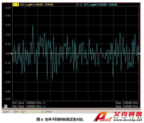 完成雙端口校準(zhǔn)后,直通連接。功率為-60dBm與-20dBm的校準(zhǔn)誤差對(duì)比如圖8所示。