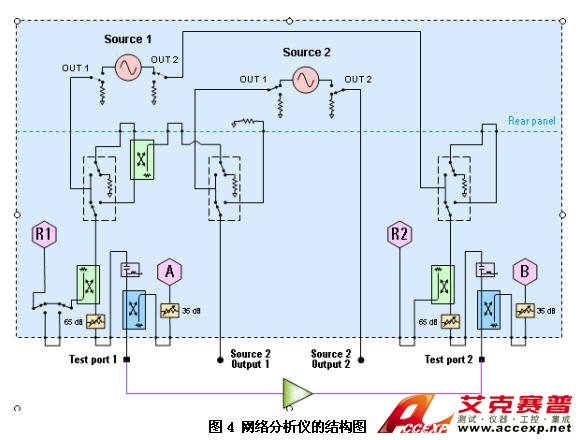要想獲取高精度的測(cè)量結(jié)果,必須非常清楚地理解網(wǎng)絡(luò)分析儀的系統(tǒng)結(jié)構(gòu)。安捷倫最新的網(wǎng)絡(luò)分析儀PNA-X的系統(tǒng)結(jié)構(gòu)如圖4所示