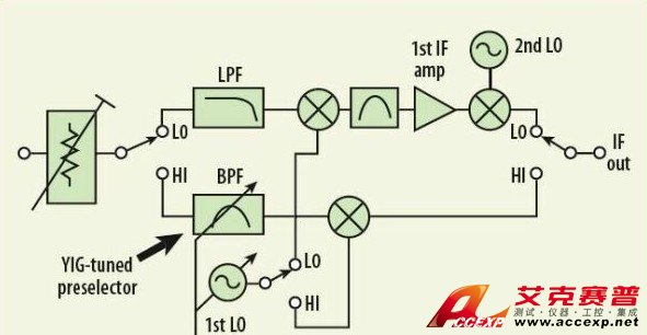 工作在26.5GHz的現(xiàn)代頻譜分析儀具有一個(gè)“低頻帶”和一個(gè)“高頻帶”信道,如圖1所示。低頻帶通常可工作在3GHz或更高頻率。在低頻帶上,信號(hào)上變頻到接近4GHz或更高的高IF頻段,然后再下變頻到接近300MHz的較低IF頻段。這種雙變頻方式可以極大地減少混頻器鏡像響應(yīng)。