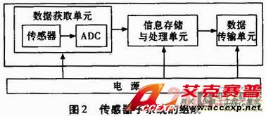傳感器、感知對象和觀察者是傳感器網(wǎng)絡(luò)的三個基本要素。網(wǎng)絡(luò)中的傳感器節(jié)點(diǎn)(或稱為傳感器子系統(tǒng))由電源、數(shù)據(jù)獲取單元、信息存儲與處理單元和數(shù)據(jù)傳輸單元構(gòu)成,如圖2所示。電源為傳感器提供正常工作所必需的能源。數(shù)據(jù)獲取單元用于感知、獲取外界的信息,并將其轉(zhuǎn)換為數(shù)字信號。信息存儲與處理單元對數(shù)據(jù)獲取單元傳來的信息進(jìn)行必要的處理、保存,數(shù)據(jù)傳輸單元負(fù)責(zé)與其他傳感器或接收發(fā)送器之間的通信。觀察者是傳感器網(wǎng)絡(luò)的用戶,是感知信息的接受者或任務(wù)管理者,觀察者可以是人,也可以是計(jì)算機(jī)或其他設(shè)備。