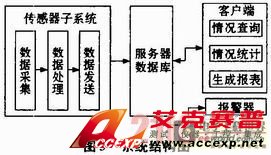 運(yùn)用傳感器網(wǎng)絡(luò)進(jìn)行環(huán)境監(jiān)測的系統(tǒng)結(jié)構(gòu)圖如圖3所示,系統(tǒng)硬件設(shè)備由傳感器子系統(tǒng)、服務(wù)器、客戶機(jī)和報警器組成。