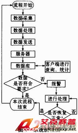 系統(tǒng)流程如圖4所示。針對不同的環(huán)境,根據(jù)需要采集的參數(shù)類型(溫濕度數(shù)據(jù)、煙感數(shù)據(jù)、煤氣感應(yīng)數(shù)據(jù)等)選擇相應(yīng)的傳感器,構(gòu)成相應(yīng)的傳感器子系統(tǒng),傳感器子系統(tǒng)將采集到的數(shù)據(jù)經(jīng)過處理后發(fā)送到服務(wù)器,服務(wù)器將接收到的數(shù)據(jù)自動存入數(shù)據(jù)庫,當(dāng)數(shù)據(jù)超出規(guī)定的范圍時啟動報警器進(jìn)行報警,提醒值班人員及時進(jìn)行處理。值班人員也可以隨時通過客戶端軟件訪問服務(wù)器,對環(huán)境參數(shù)進(jìn)行查詢、統(tǒng)計(jì)、生成報表,隨時掌握環(huán)境狀態(tài)。