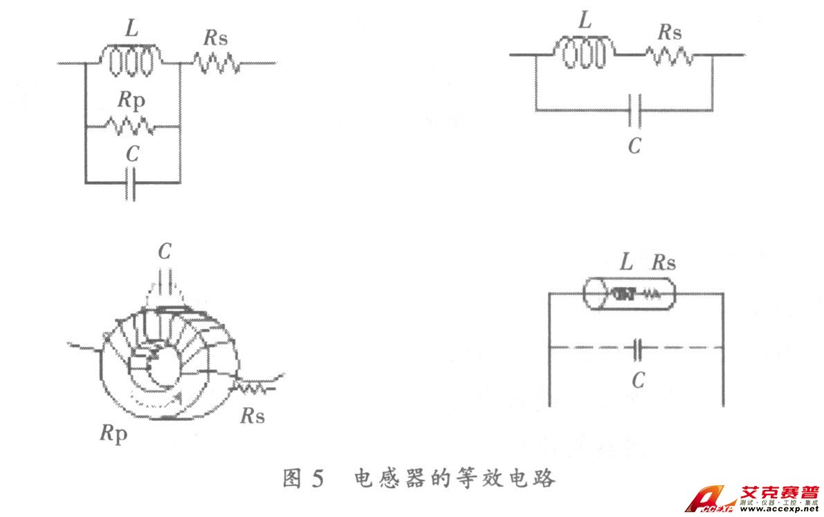 電感器由纏繞在磁芯上的導線構成, 其特性則由所使用的磁芯材料決定。空氣是構成電感器最簡單的磁性材料, 但為使電感器具有更高的電感量,經常用鐵、鐵氧體等磁性材料做磁芯。電感器的典型等效電路如圖5 (a) 所示, 圖中Rp 代表磁性的鐵耗, Rs 代表導線的銅耗, C 是繞線間的分布電容。對于低值電感應使用圖5 (b) 所示的等效電路。由于L 值很小, 繞組間的分布電容就成了主要的影響因素。