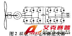 1)利用雙反饋感應發電機(DFIG)的變速技術:這種強迫開關的功率變流器的原理圖如圖1所示。變流器包括兩個三相AC—DC功率變流器,兩者由一個直流電容器電池鏈接。這種結構一方面保證對機器的有功功率和無功功率進行矢量控制,另一方面還能減少功率變流器注入電網的諧波大小。