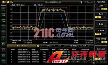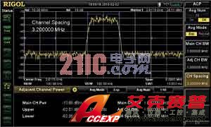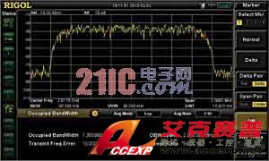 對于問題一和問題二可以采用DSA1030A頻譜分析儀中的ACP鄰道功率測量和OBW占用帶寬測量來解決。領道功率測量可以測量主道功率、前一信道和后一信道的功率、以及主道與上下鄰道之間的信噪比測量,圖1中左下方為測量結果。用戶根據特定的需要靈活設置主道帶寬、鄰道帶寬以及主道和鄰道之間的間距的大小,圖1中右下方為測量設置值。通過利用領道功率測量的功能可以清楚地測出通道通信的能量大小以及通信的信噪比。從圖1可以得出主道能量為-10.69dBm且基本上集中在1.6MHz的帶寬內,符合TD-SCDMA信號每個載波的帶寬為1.6MHz的要求。鄰道抑制為-51.32d和-51.66dB,可以滿足一般的需要B和-51.66dB,可以滿足一般的需要。