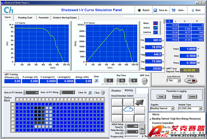 照度下I-V曲線達4096點另外內建國內NB/T-32004、CGC-GF035及國際EN50530, Sandia動態MPPT測試法規及獨創動態屏蔽曲線仿真(圖一),以應用于光伏逆變器