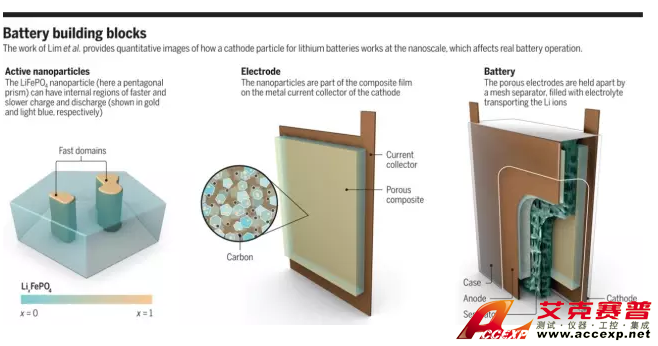 利用高分辨X射線吸收光譜,原位追蹤研究了LiFePO4正極材料中單個納米顆粒在充放電過程中的行為。發現,當循環速率較快時,形成固溶體。當速率較慢時,顆粒內部發生納米尺度的相分離,最終縮短電池的壽命。