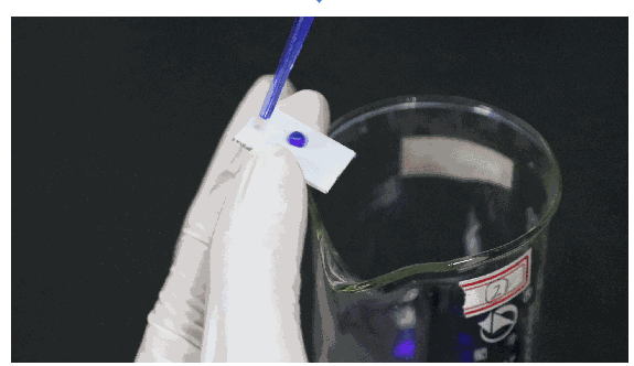 實驗介紹 :實驗者手中拿著的是通過將高分子聚合物和無機化合物相結合制備具有超疏水性的涂層材料,將染色后的水滴滴在材料上,就會出現超疏水效應。