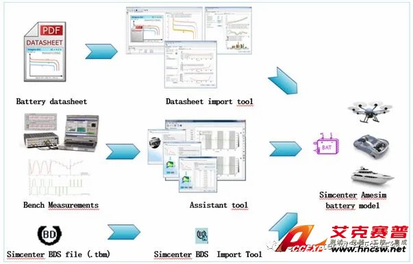 Amesim軟件中為了降低軟件建模的使用難度,提供了電池建模的多個可視化的自動化建模工具,如電池數表導入工具,特別是根據電池HPPC提供的電流和電壓數據自動快速的識別電池的OCV、內阻和極化等參數,完成電池模型模型,用于進一步的熱管理、整車等系統集成分析;另外,專門開發了Simcenter BDS的數據導入工具: