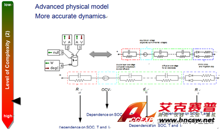 簡單電池模型中只考慮SOC對電池性能的影響。而準穩態模型參數除了soc,還依賴于溫度。也可以建模仿真磁滯效應:電池充電和放電時,對應不同的開路電壓值。此外,可以考慮熵的影響,它是由電池內部的化學反應引起的,可以是放熱或者吸熱過程,且會增加電(阻力)熱流,因此,在電池及EV熱管理建模分析中,為了考慮準確的系統發熱邊界,準穩態電池模型是合理的選擇之一。