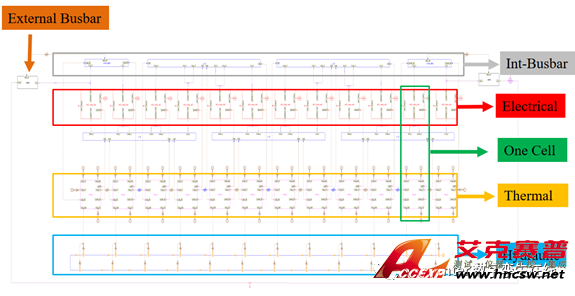 將離散的單體熱容模型,和電池的電模型、液冷板模型集成,再將單體模型進一步的集成為電池模組熱管理模型: