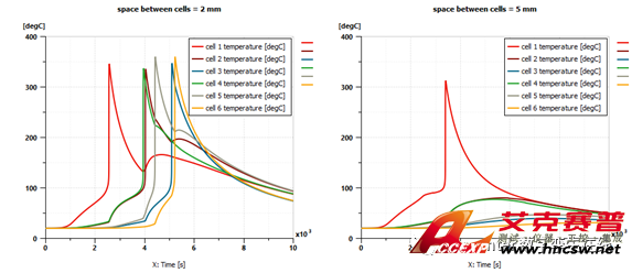 上述模型中,當單體間距2mm時,從單體1開始,每個單體依次發生熱失控;當單體間距5mm時,只有單體1發生熱失控,其他單體只是溫度增加,未達到熱失控引發溫度。