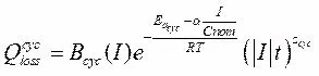 式中,為循環壽命容量衰減百分比,單位為%;為指前因子,是電流I的函數;為活化能,單位為J/mol;是無量綱常數,為衰減因子,t的單位為h。