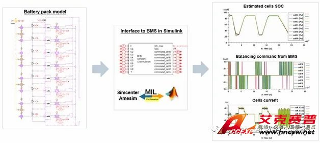 Amesim 中建立的電池被空對象模型,應用于BMS控制開發的不同階段。在MIL測試環境中,控制和被控對象的耦合模型能在很短時間內快速驗證控制策略,例如能在幾分鐘內給出SOC的準備評估,同時支持代碼自動生成。