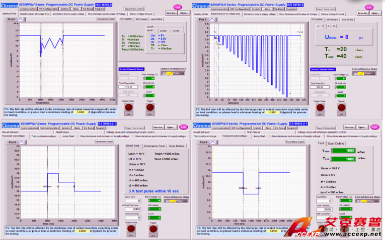 Chroma最新推出汽車環(huán)境電力負載試驗軟件,此SoftPanel軟件已內建ISO 16750-2、GS 95024-2-1及VW 80000標準于62000P&H系列直流電源產品,可簡易聯(lián)機控制直流電源供應器提供圖形化測試曲線進行測試,此非常適合研發(fā)及品保單位對 LED頭燈、ECU、雨刷馬達、電動車窗、車用音響、GPS、充電器..等車用電子產品做長時間性能及穩(wěn)定性驗證。汽車零組件電力負載測試軟件將依照 ISO 16750-2、GS 95024-2-1及VW 80000規(guī)范,