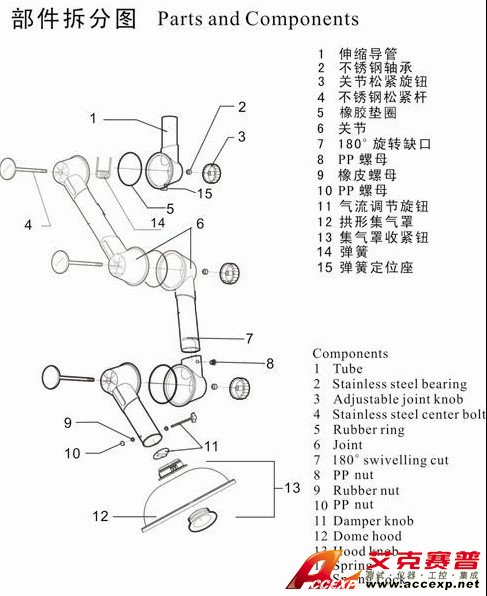 臺雄SAN-6103M三節萬向抽氣罩采用高密度PP材質,可360°旋轉調節方向,易拆卸、重組及清洗,不易老化之高密度橡膠,使用304不銹鋼精制而成。