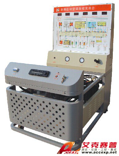 三相調速電動機、空調蒸發箱、壓縮泵、空調控制系統電氣元件、壓力表、送風管路、空調散熱器、干燥瓶、空調控制電腦、空調系統各傳感器及執行器、高低壓壓力表、故障設置和排除盒、控制面板、大型彩色噴繪電路原理圖、可移動臺架、電源、診斷座、發動機控制電腦及曲軸傳感器、實訓指導書。