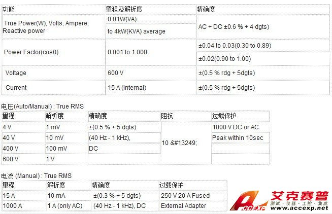 ACM-300A手持功率表主要用來測量交流或者直流家電、辦公設備的耗電量 AC/DC 1mW-4KW 可測量最大到200KW(使用1A-1000A鉗頭) 1mA-15A直接測量(±0.3%) 1v-1000V直接測量(±0.3%)(DC) 1V-600V直接測量(±0.3%)(AC) 顯示:W,VA,Var,PF,V,A,頻率,功率積分。