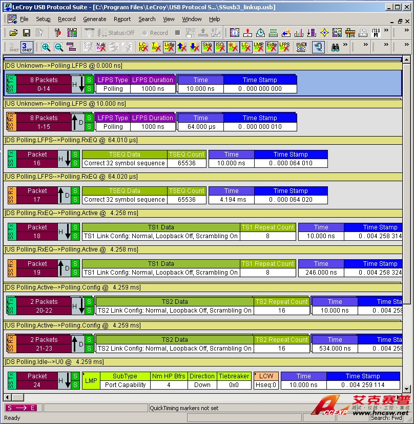 Voyager是市場上唯一可捕獲5Gbps USB鏈路上每個過渡(包括空閑,數據包間符號和損壞的10位符號)的分析器。鏈接跟蹤器按時間順序顯示所有有序集的上游/下游顯示,定時分辨率為2ns。為幫助進行低級調試而設計,所有符號(包括訓練序列)都可以原始10位,8位,加擾和未加擾的十六進制格式顯示。單擊即可進行符號到符號的時序測量。