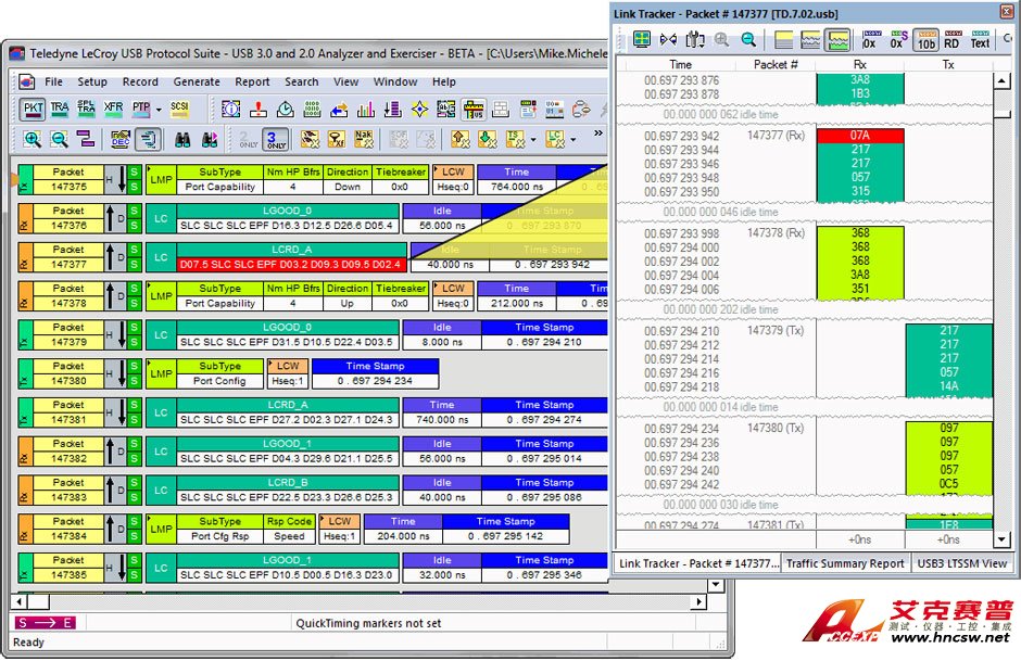 Voyager使用了傳奇的CATC Trace-行業實際的USB 2.0協議分析標準。跟蹤查看器軟件使用顏色和圖案來訓練眼睛以更快地了解信息。當記錄SuperSpeed集線器上游的混合流量時,舊版2.0和3.0數據包會在單個顯示器中進行標記和交錯。每個事件都顯示在單獨的行上,每個字段都標記并用顏色編碼。.邏輯2.0和3.0通道的流量可以單獨進行跟蹤過濾,搜索或導出。可以擴展和折疊USB傳輸級別,以顯示包括所有鏈路管理數據包(LMP)和流控制符號的數據包層。