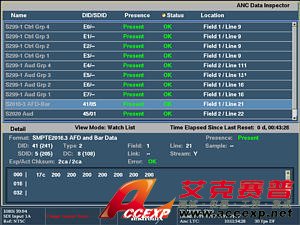 利用Aux數(shù)據(jù)狀態(tài)顯示,可以監(jiān)視附屬數(shù)據(jù)(包括隱蔽字幕、時(shí)間 碼和AFD 等)。