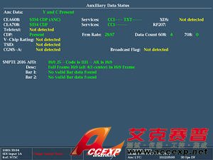 在輔助數(shù)據(jù)狀態(tài)顯示中,按照SMPTE 2016標(biāo)準(zhǔn)提供了有效格 式描述符(AFD)的簡(jiǎn)明信息,此外還有視頻索引寬高比(Video Index Aspect Ratio)、寬屏信令(WSS)、V-Chip、TSID、 CGMS-A、廣播標(biāo)志、CEA708/608隱蔽字幕、圖文電視以及 時(shí)間碼等信息。
