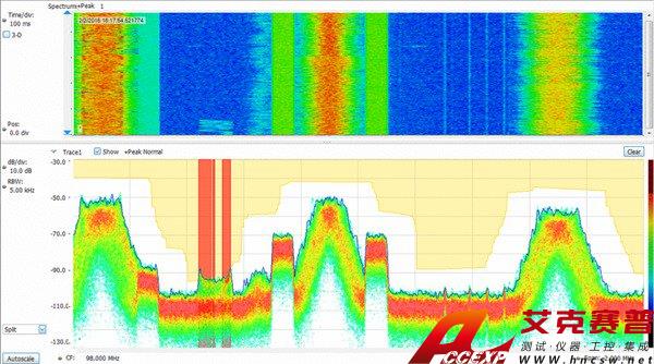 通過無人值守的模板監測功能,可以簡便地查找意想不到的信號??梢栽贒PX頻譜畫面上創建一個模板,在每次違規時采取相應操作,包括停止采集、保存圖片、保存采集或發送聽得到的告警聲。在下圖中,模板中紅色的地方發生了模板違規,保存了得到的屏幕圖片。模板測試可以用于無人值守監測,在播放記錄的信號時,可以在相同信號上測試不同的違規。