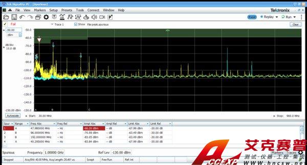 可以使用儀器和 SignalVu-PC,簡便地完成 EMI 預一致性測試和診斷測量??梢栽谛U募休斎牒痛鎯ψ兯推?、天線、前置放大器和電纜增益/損耗,可以使用SignalVu-PC的標準雜散測量功能,為測試確定極限行。下圖顯示了 30MHz ~ 960?MHz 測試,其中陰影部分是 FCC Part 15?Class A 極限。藍色譜線是捕獲的環境特點。違規記錄在圖下的結果表中??梢酝ㄟ^選項 SVQP 增加 CISPR 準峰值和平均值檢測器。