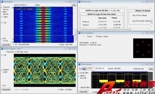 SignalVu-PC應用SV26可以分析APCO P25信號。下圖顯示了使用三維頻譜圖監測第二期HCPM信號中的異常事件,同時根據TIA-102標準規范執行發射機功率、調制和頻率測量。