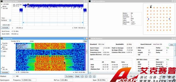 帶選件 SV23、24?和 25,可以方便地進行完善的 WLAN 測量。在下面所示的 802.11ac (20?MHz) 信號中,三維頻譜圖顯示了初始導頻序列,后面是主信號突發。數據包的調制自動檢測為64 QAM,顯示為星座圖。數據摘要顯示EVM 為-37.02?db RMS,突發功率測得 -17.32?dBm。SignalVu-PC 應用程序適用于帶寬高達 40?MHz 的 802.11a/b/j/g/p、802.11n 和 802.11ac。