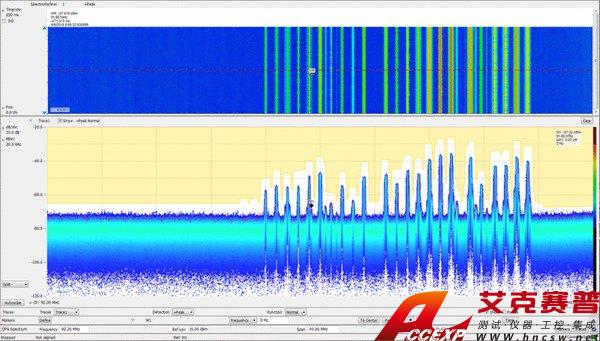 由于 40?MHz 實時帶寬,獨特的 DPX 頻譜/三維頻譜圖顯示干擾信號或未知信號發生的每個時點,支持的最短持續時間可達 27?μs。下圖顯示了WLAN 傳輸( 綠色和橙色),在屏幕中重復出現的窄信號是一只藍牙接入探頭。三維頻譜圖( 屏幕上方部分) 在時間上把這些信號清楚地分開,顯示任何信號碰撞。