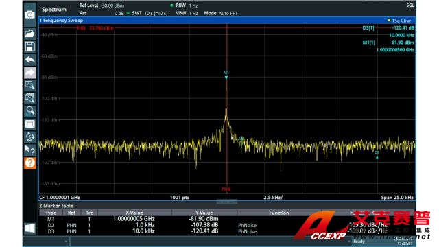 R&S FPL1000 可與高級別分析儀相提并論,它在 10 kHz 偏置(1 GHz 載波)時(shí)的相位噪聲典型值為 –108 dBc (1 Hz),三階互調(diào)截取點(diǎn)典型值為 +20 dBm,分辨率帶寬為 1 Hz 至 10 MHz,顯示平均噪聲電平典型值為 –163 dBm。因此,它非常適合在實(shí)驗(yàn)室、生產(chǎn)以及維修任務(wù)中使用。