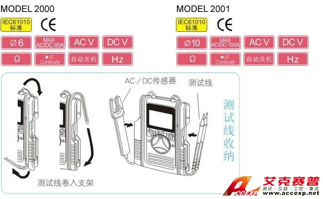 開口傳感器測量AC和DC電流可達60A(2000)/100A(2001)。 長條圖顯示3400讀數(shù)。 袖珍型,可吸收沖擊力的軟墊防震外殼設(shè)計。 自動關(guān)機功能可減少電池消耗。 設(shè)計符合國際安全規(guī)格 IEC61010-1 CAT.III 300V。 |