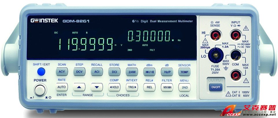 GDM-8261數字萬用電表,6 1/2位顯示:1,200,000位,DCV基本精確度:0.0035%,雙顯示測量,真空熒光顯示屏(VFD),USB接口傳輸速率高達2,400次讀值/秒,標準接口:USB、RS-232C、Digital I/O,選配接口:GPIB或LAN