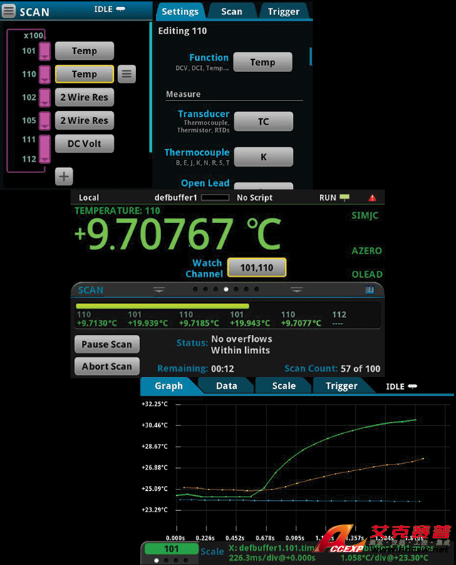 設(shè)置和運(yùn)行測(cè)試簡(jiǎn)單快速,無需編寫測(cè)試程序。 DAQ6510 數(shù)據(jù)采集和記錄萬用表系統(tǒng)的直觀觸摸屏能夠提供簡(jiǎn)單的配置,以及可視的直觀測(cè)試設(shè)置、實(shí)時(shí)的掃描狀態(tài)可視信息,可盡早捕捉問題以避免丟失測(cè)試時(shí)間,便于分析測(cè)試數(shù)據(jù)。