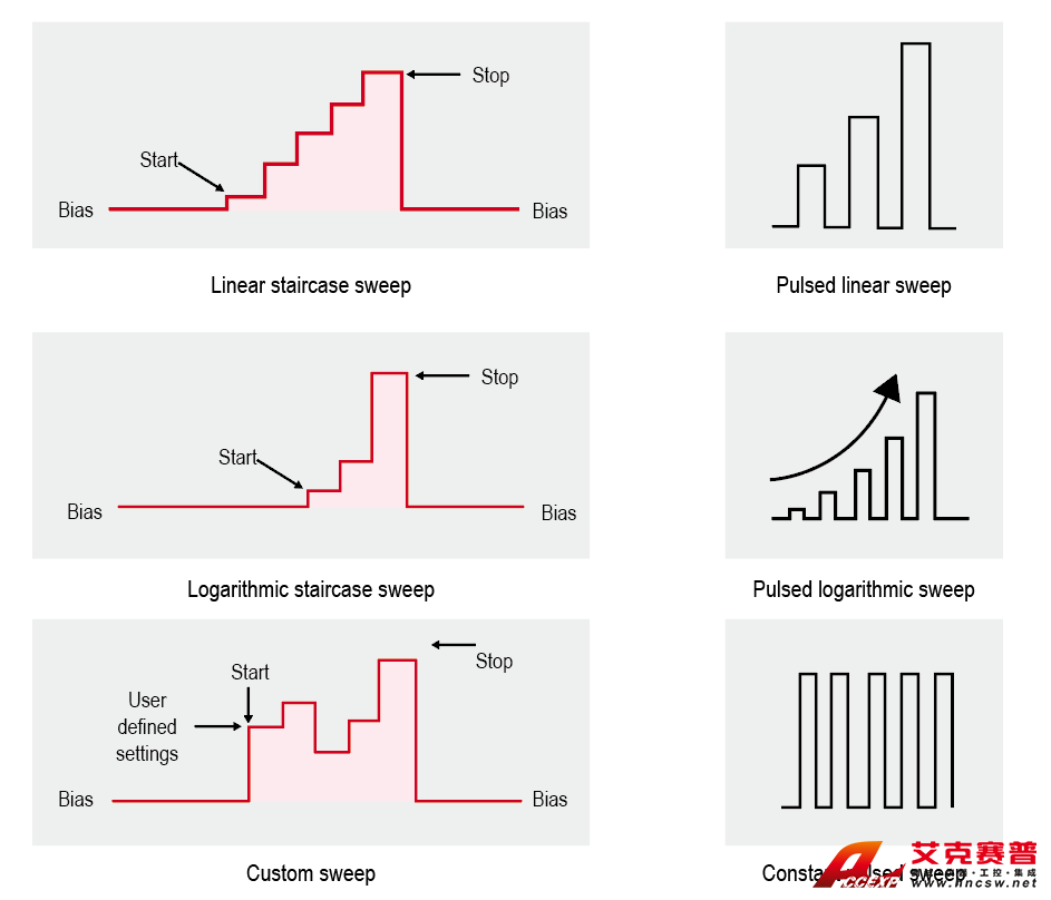 IT2800系列SMU具備標準和列表LIST掃描功能。標準SWEEP模式下,支持線性和對數模式,單次和雙次掃描功能以及恒定和脈沖掃描功能。列表LIST掃描功能可以有效地執行任意波形輸出,在表征響應隨應用電壓或電流而變化的測試中非常有用,用戶可以使用Excel導入或面板編輯的方式,生成一個任意形狀的掃描曲線,最多可以導入99999點數據,是U-I和I-U特性測試的理想選擇。