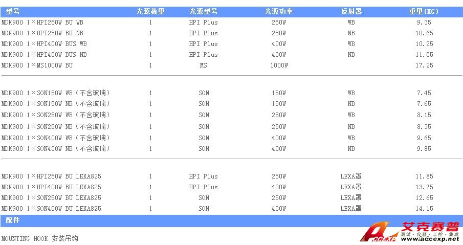 ●適合選配中低功率HID光源:150W、250W或400W HPI/SON,也可根據(jù)
