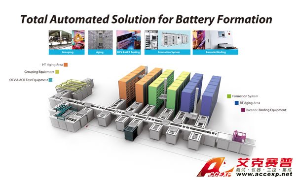 Chroma在化成制程中提供輔助制程的設備,其一為電池綁定設備,由設備連結載盤與電池之相對位置并上傳信息給 FMS。并由 FMS(Formation Management System) 聯機控制,同時接受FMS之流程控制信息,以及上傳載盤條形碼信息及鏈接數據作業。 其二為重工分選機用于于各制程中不良產品進行撿出,并將Cell數據從Tray ID數據訊移除。其三為電池分選設備,此分選設備可依使用者先行設定之各分選等級,由 FMS (Formation Management System) 將分選后的分級數據傳送與分選設備,而分選設備會將各電池移動至分選后的載盤上。