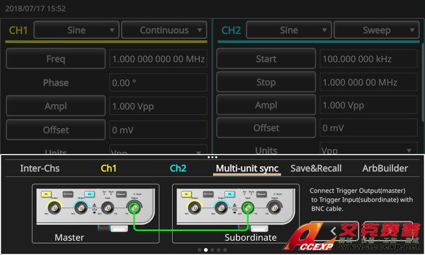 AFG31000 簡(jiǎn)化了這個(gè)過(guò)程,它在屏幕上有一個(gè)向?qū)Чぞ撸梢砸龑?dǎo)用戶(hù)完成電纜連接和設(shè)置配置,實(shí)現(xiàn)多臺(tái)發(fā)生器同步。